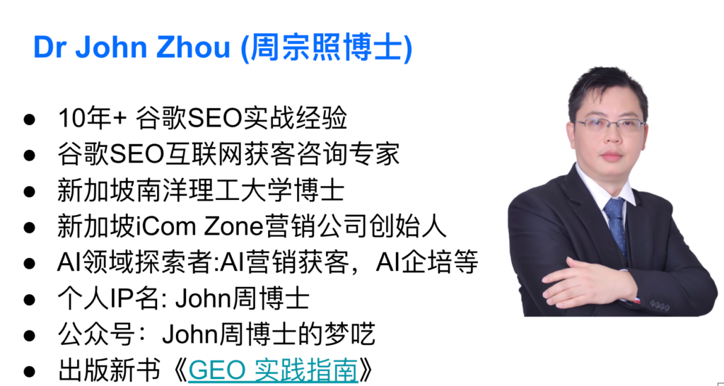 大家好,我是周宗照, 英文名John(个人IP名:John周博士), 新加坡南洋理工大学博士,新加坡iCom Zone Singapore营销公司创始人。在新加坡主要通过Google SEO帮助出海企业打造从谷歌获取精准客户的长期互联网获客渠道。优势在于不仅有自己亲自从0到1成功实施新加坡本地网站的本地Google SEO的的经验,也有培训和指导企业客户内部团队成功实施横跨多个国家的国际Google SEO的经验。